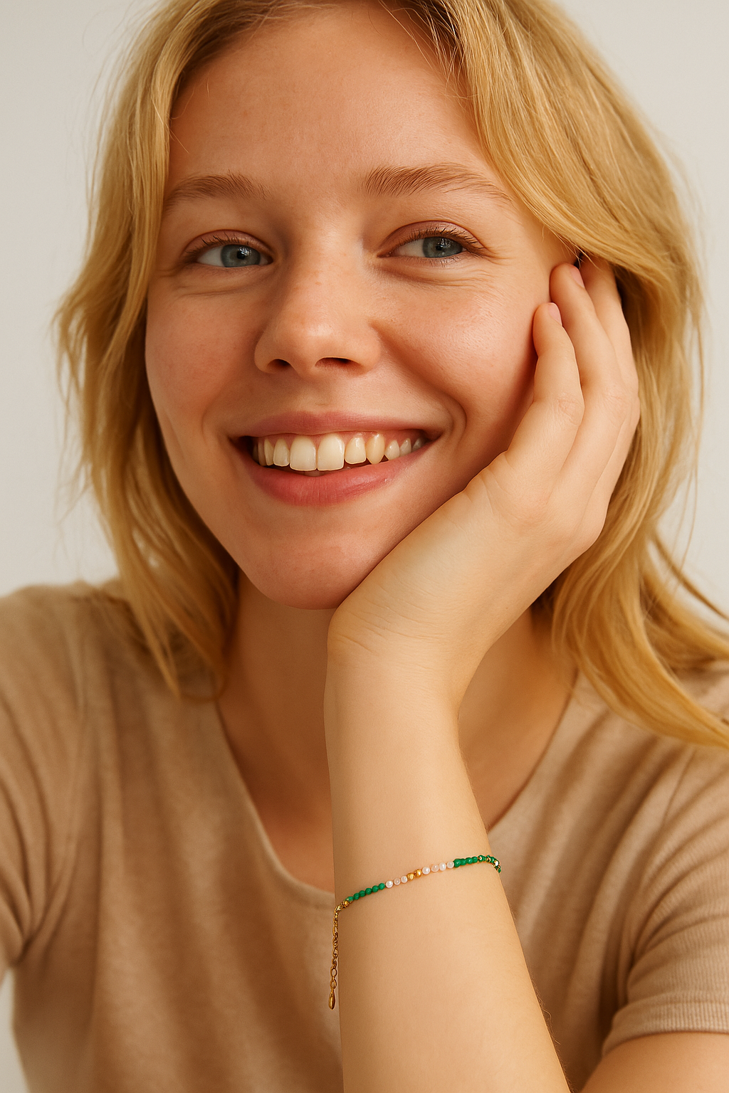 Bransoletka wykonana jest z naturalnych kamieni, co sprawia, że każda z nich może mieć unikalny wygląd. Zdjęcie produktu ma charakter wyłącznie poglądowy.